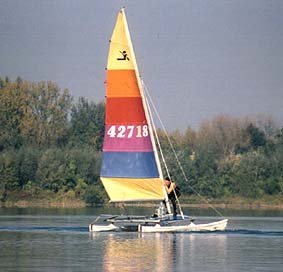 | Doch der läßt nicht mit sich scherzen! Plötzlich fegt eine Bö mit unbändiger Stärke über den See und reißt einen der beiden Catamarane nieder! |