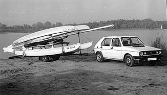 | Das Boot steht sicher und fest auf seinen Schwimmern. Nun noch ein kurzer Schwung auf das Trampolin und schnellstens ans Ufer. Denn: Wer weiß ob das schon alles war? |